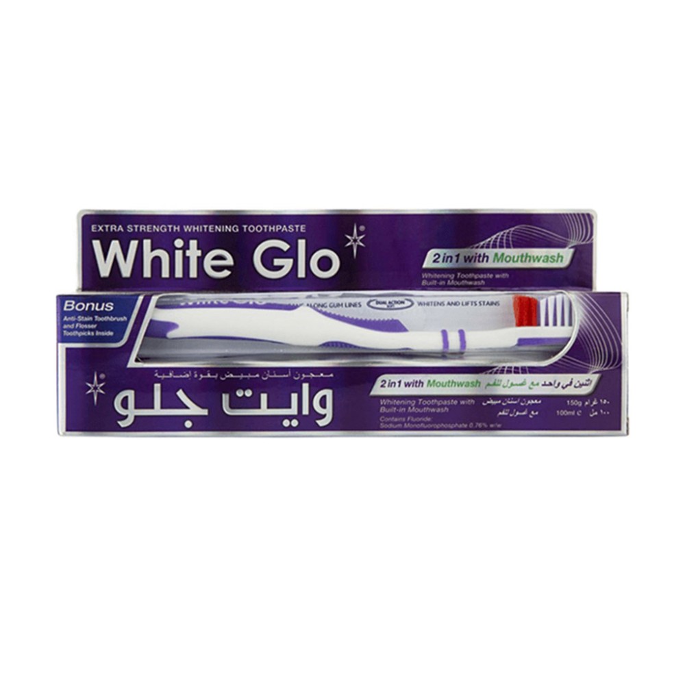 - معجون تبييض الأسنان الفريد ذو القوة المزدوجة مع قاعدة غسول الفم من وايت جلو.